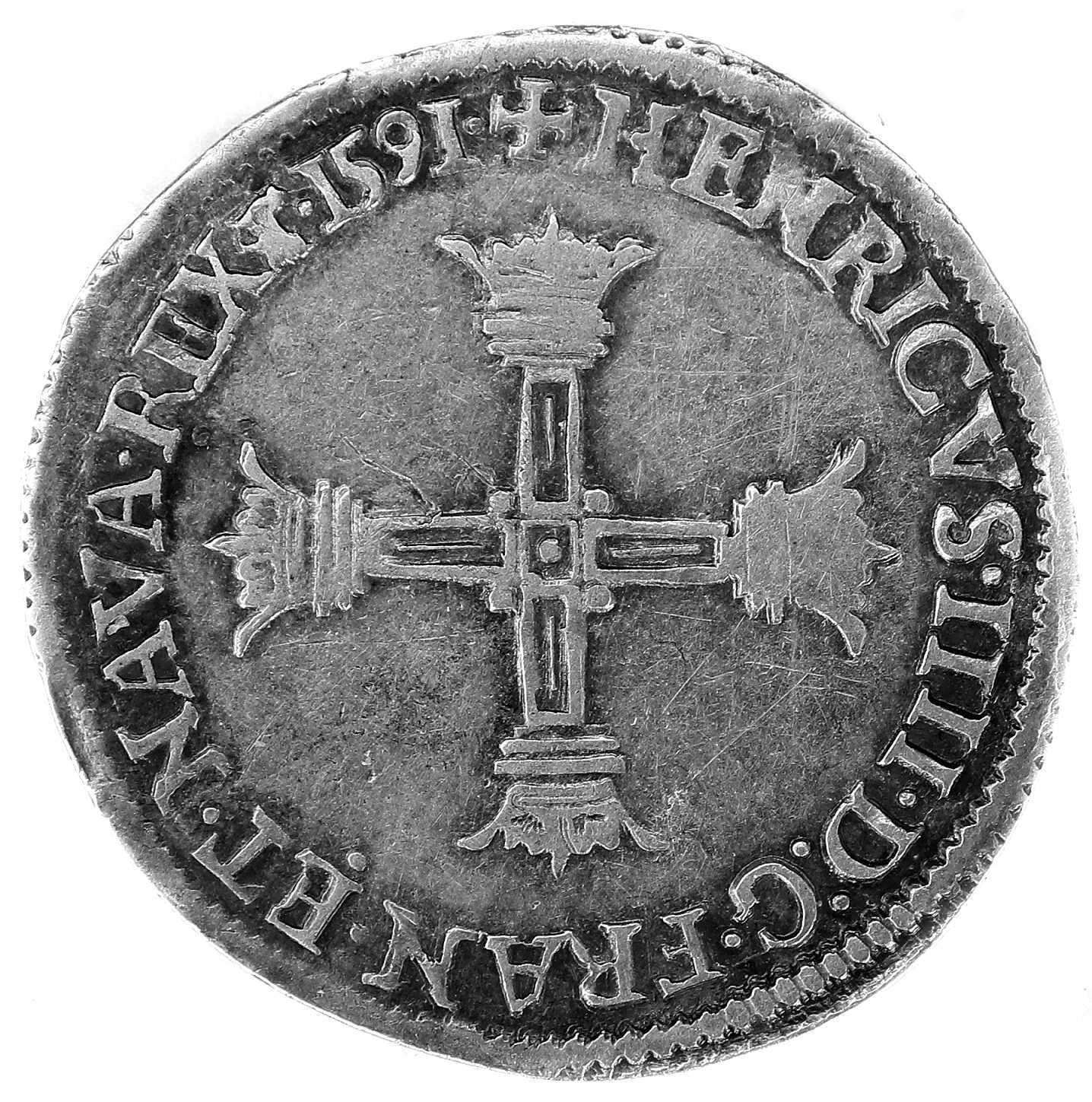 +HENRICVS. IIII.D.G.FRAN.ET.NAVA.REX(dif).1591 Henri IIII par la grâce de Dieu roi de France et de Navarre. Croix formée de quatre batons couronnés |