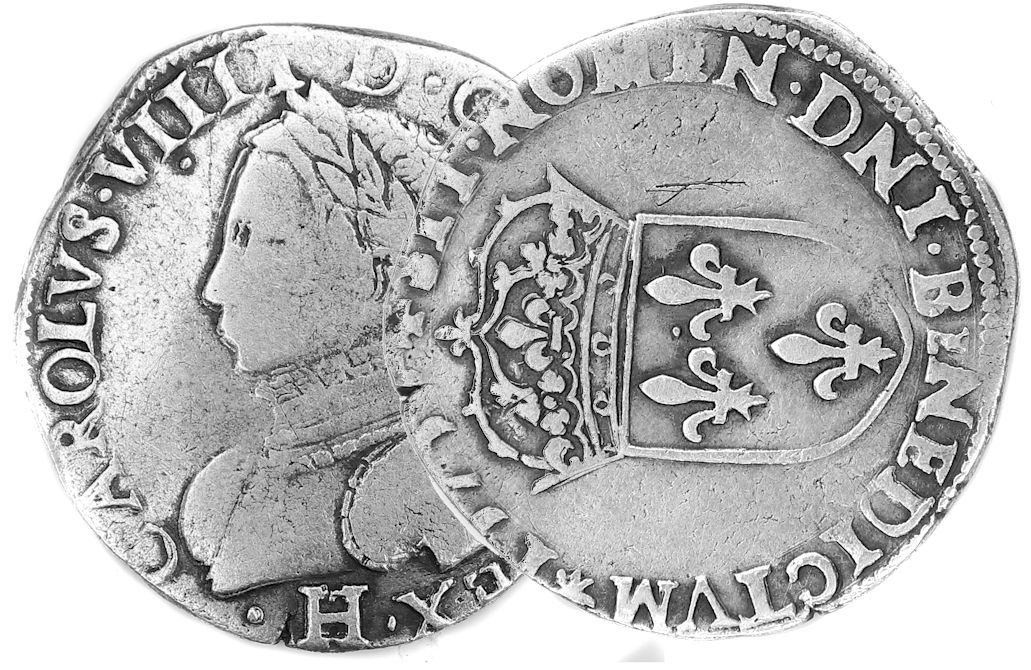 CAROLVS.VIIII.D.G.FRANCO.REX. H Charles VIIII par la grâce de Dieu roi des Francs Buste du roi, à droite, cuirassé et tête nue